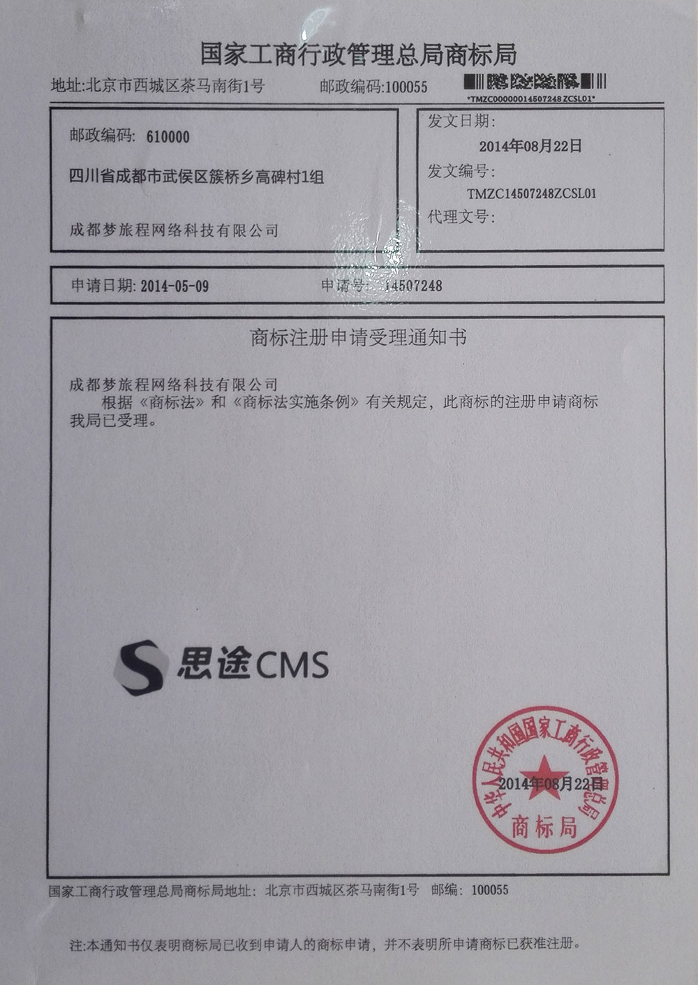 思途CMS商標(biāo)證書(shū) 申請(qǐng)編號(hào):14507248
