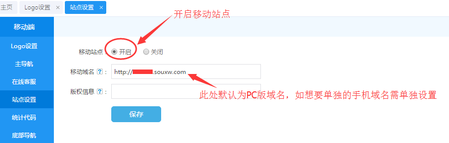 2、在系統(tǒng)后臺(tái)開啟移動(dòng)站點(diǎn),并設(shè)置好移動(dòng)端域名: