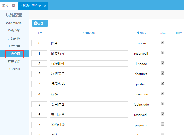 2.在上圖的操作界面可以對(duì)線路產(chǎn)品信息的內(nèi)容分類名稱進(jìn)行編輯和整理。具體操作解釋如下: