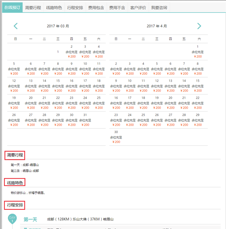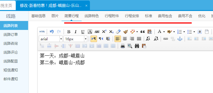 3、設(shè)置好內(nèi)容介紹之后,在編輯線路產(chǎn)品時(shí)會(huì)出現(xiàn)相應(yīng)的分類,填充完成前臺(tái)就會(huì)按設(shè)置的排序進(jìn)行展現(xiàn)。