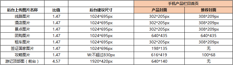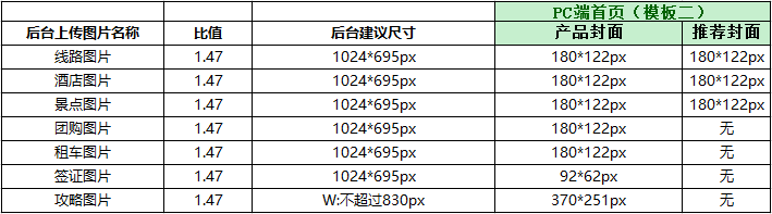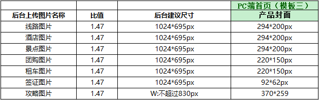 (1)電腦端的圖片上傳建議尺寸與前臺顯示的尺寸列表