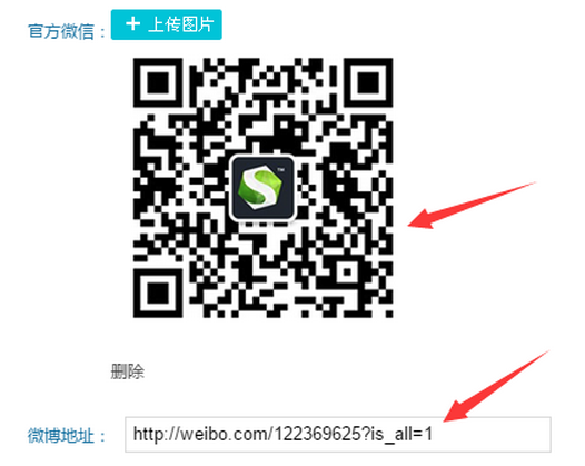上傳官方微信二維碼的圖片、填寫微博的地址,在前臺客服欄目中可以進行掃描和跳轉(zhuǎn)