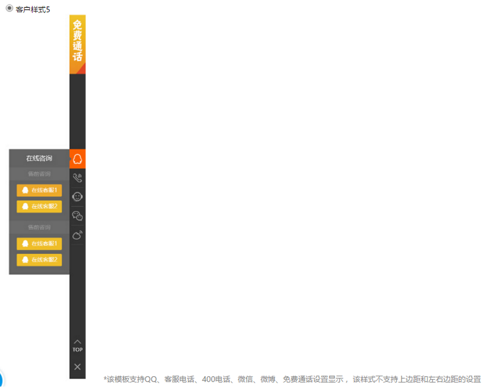 (5)客戶樣式5:支持QQ客服、客服電話、400電話、微信二維碼、官方微博、以及免費電話的顯示,點擊TOP可以 回到頂部