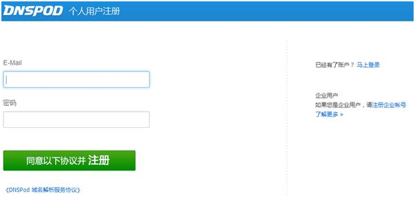 2、在賬戶注冊界面,輸入您郵箱,及密碼,詳讀《DNSPod域名解析服務協議》后,點擊【同意以下協議并注冊】