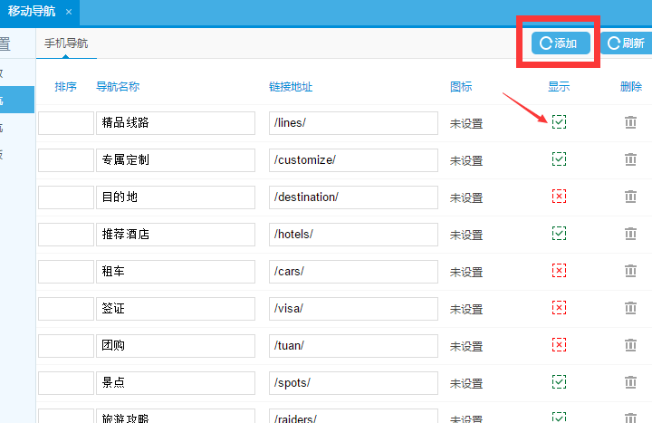 第二步:添加主導航,添加完成后,是否需要前臺展示進行勾選。