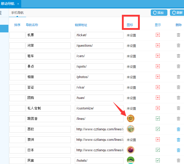主導航添加成功后,需要加上有效的鏈接地址才能夠進行頁面的跳轉。比如:添加一個西歐的主導航,鏈接地址就需要您在移動版網站前臺,搜索找到西歐這個目的地,然后復制這個頁面的鏈接到移動導航的鏈接地址上面,這樣點擊西歐這個主導航,才能跳轉到關于西歐的產品頁面。(鏈接是需要移動版鏈接)