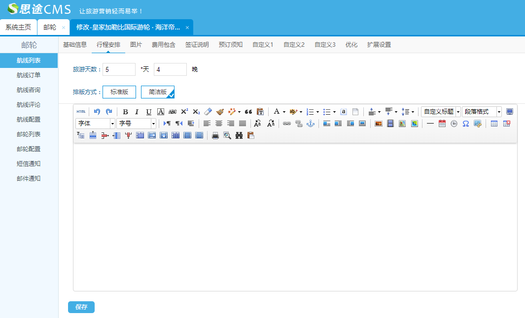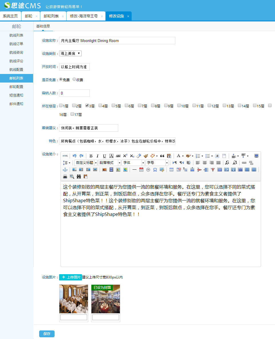 (1)添加基礎信息:包括郵輪名稱、郵輪介紹、所屬的郵輪公司、以及郵輪的基礎信息等