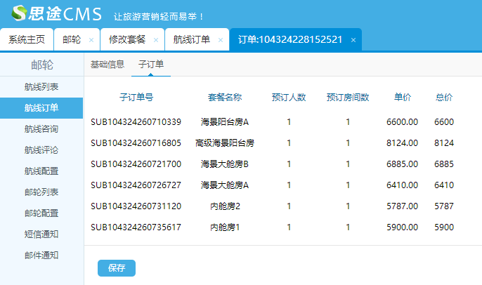 五、訂單列表:點擊查看可到訂單詳情(該航線所有資費)和子訂單(各種艙房類型下不同房型的資費)