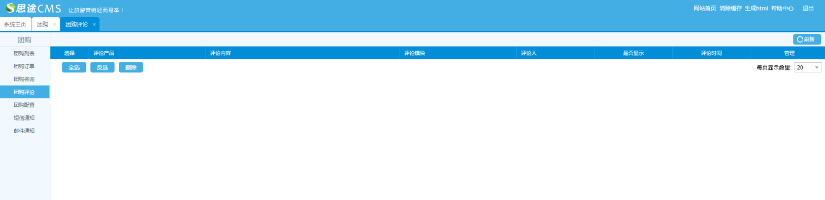 針對前臺團購產品詳情頁當中,購買該產品的用戶消費完成的評價管理,評價管理在后臺可以審核,查看隱藏,刪除等。后續考慮支持管理人員在后臺新增評價。