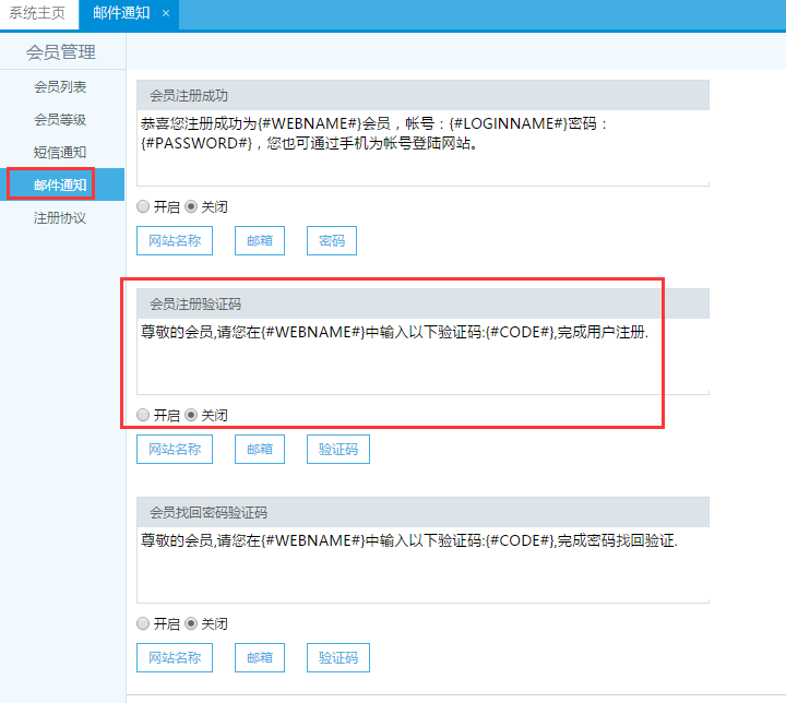 注冊驗證碼:會員收不到郵箱驗證碼,注冊流程將無法繼續,所以建議沒有設置發送郵箱接口的用戶關閉此條