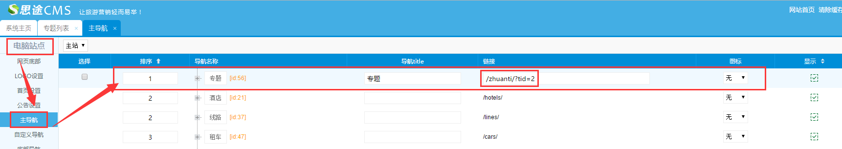 (1)在主導航添加入口:電腦站點--->主導航--->添加專題