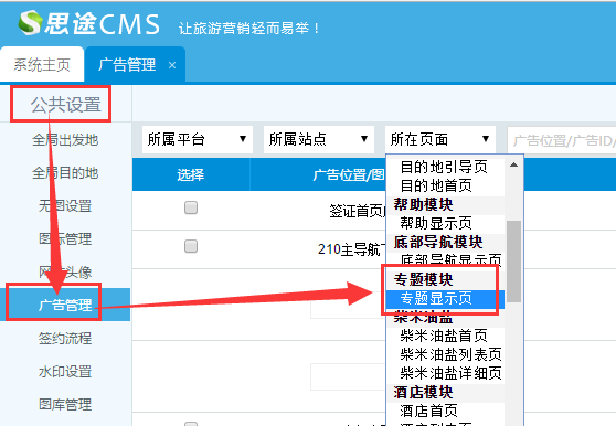 ?(3)廣告位添加:在公共設置--->廣告管理--->所在頁面選擇(專題模塊) ??