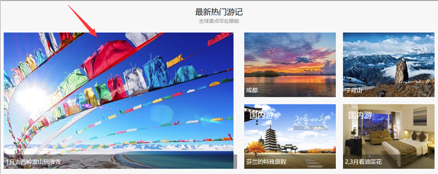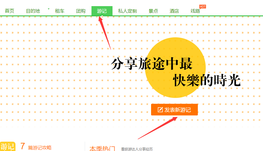 此版塊調(diào)用前臺(tái)用戶發(fā)布的游記信息,屬于和用戶互動(dòng)性板塊,建議將游記板塊展示到前臺(tái)界面上,最簡單的方法是在主導(dǎo)航中開啟,后臺(tái)操作路徑:站點(diǎn)管理》電腦端》主導(dǎo)航
