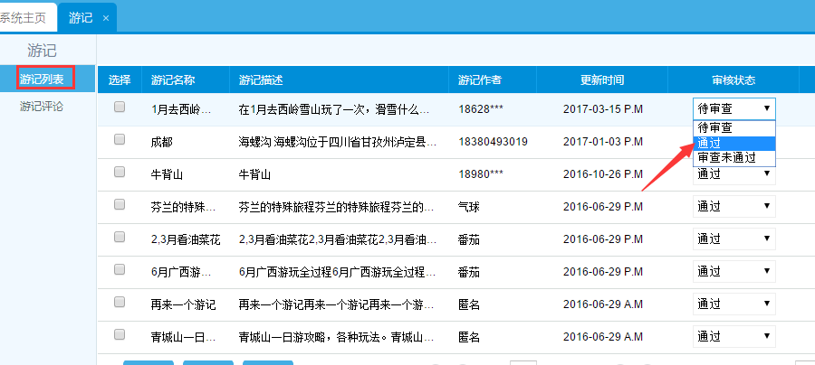 發(fā)送成功后,管理員從后臺(tái)將游此條游記審核完成后,最新的游記將排在最前面: