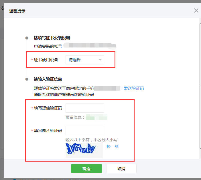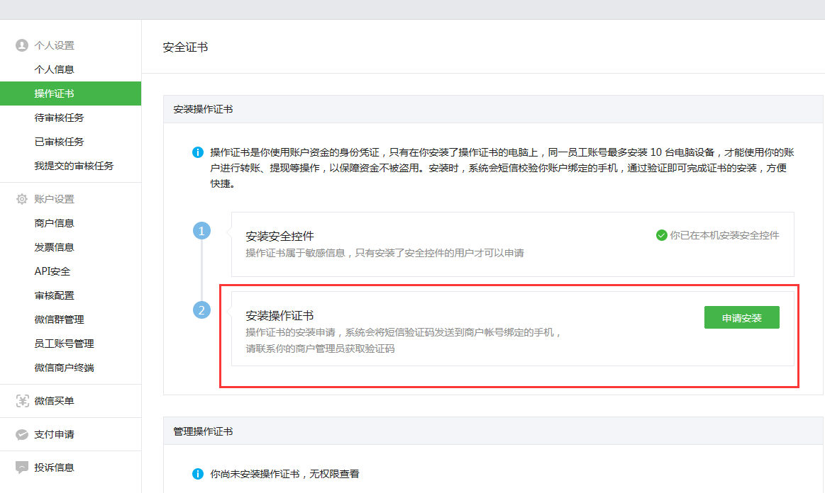 1.3注意:若您沒有安裝證書,需要先根據(jù)微信支付平臺(tái)的要求填寫信息,成功安裝微信支付證書。