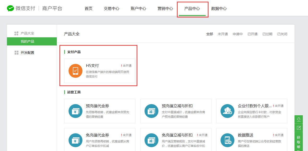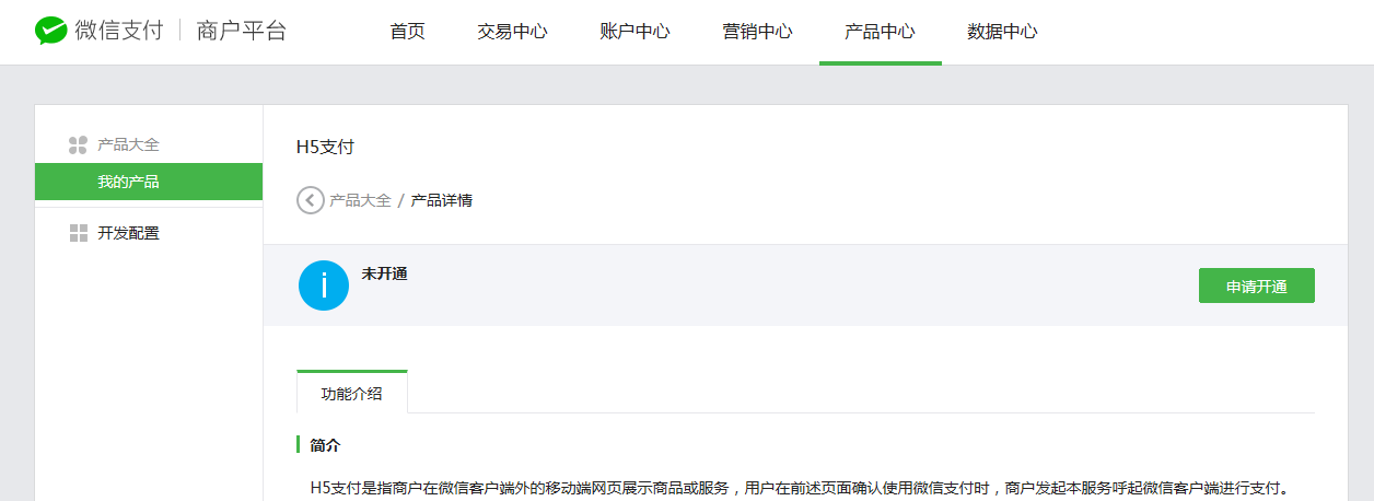 1.2在產(chǎn)品中心-支付產(chǎn)品中找到”H5支付”。點(diǎn)擊進(jìn)行申請(qǐng)