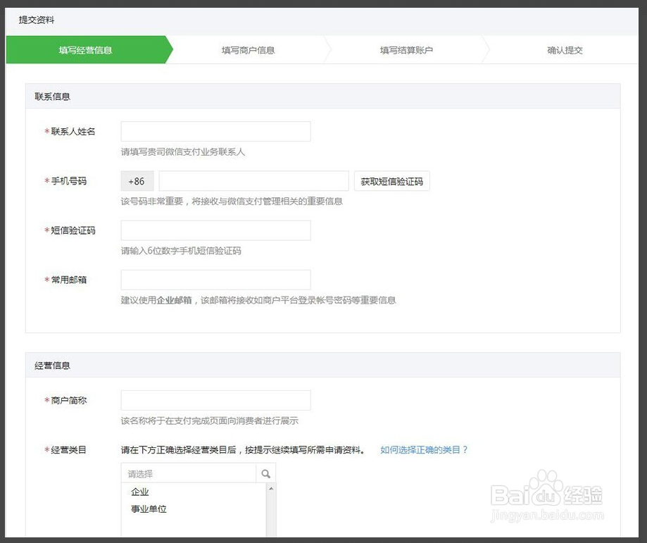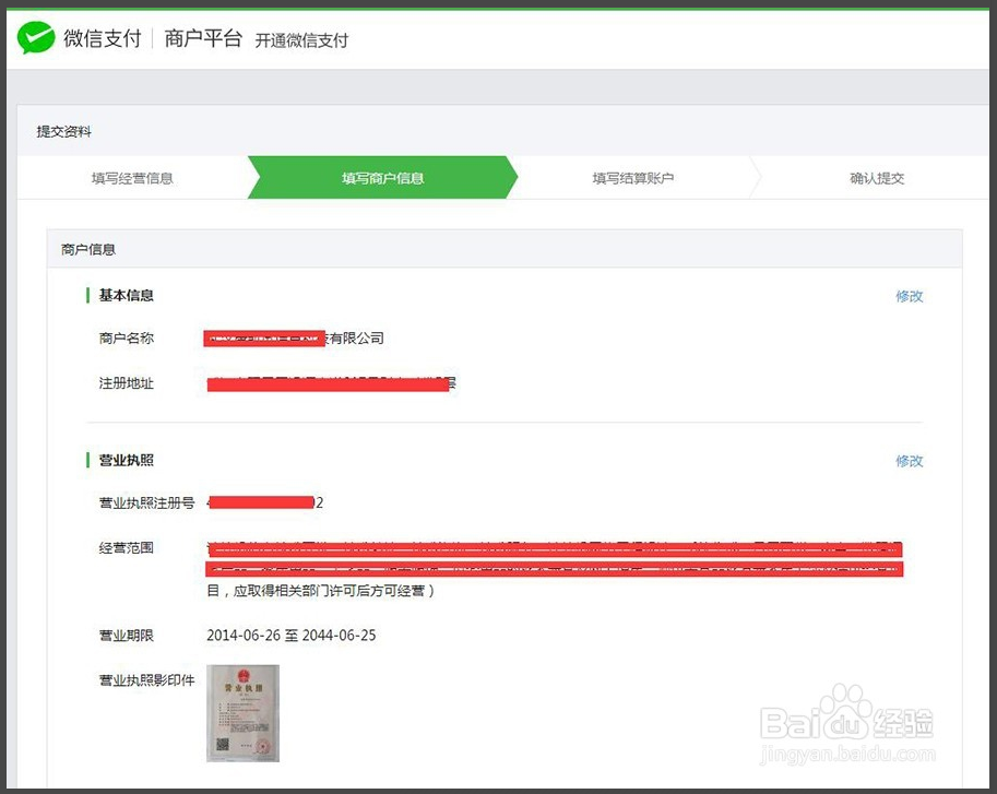 “填寫經營信息”這一步完成后,現在到了“填寫商戶信息”,其實就是一個確認過程,前面都已經填寫好了,確認沒問題就繼續點擊“保存并下一步”