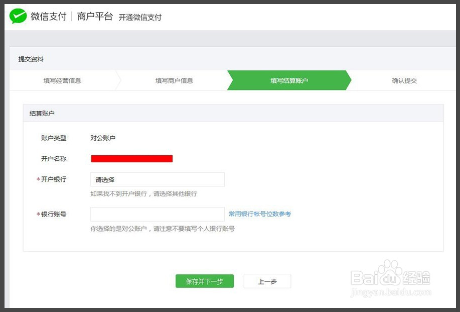 “填寫商戶信息”完成后就開始填寫結算賬戶了,這個不要填寫錯了,一定要按照企業的開戶信息來填寫,寫好之后繼續“保存并下一步”