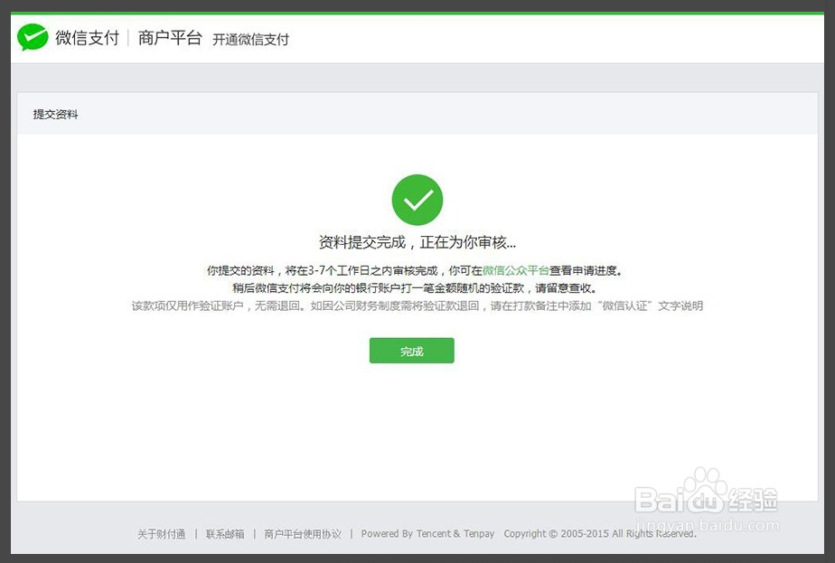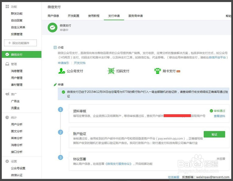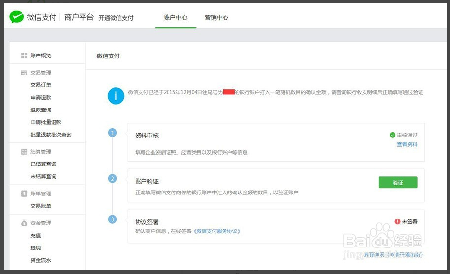 再回到微信支付商戶平臺,可以看到“資料審核”通過,“賬戶驗證”以成功驗證,“協議簽署”也已經簽署成功了。