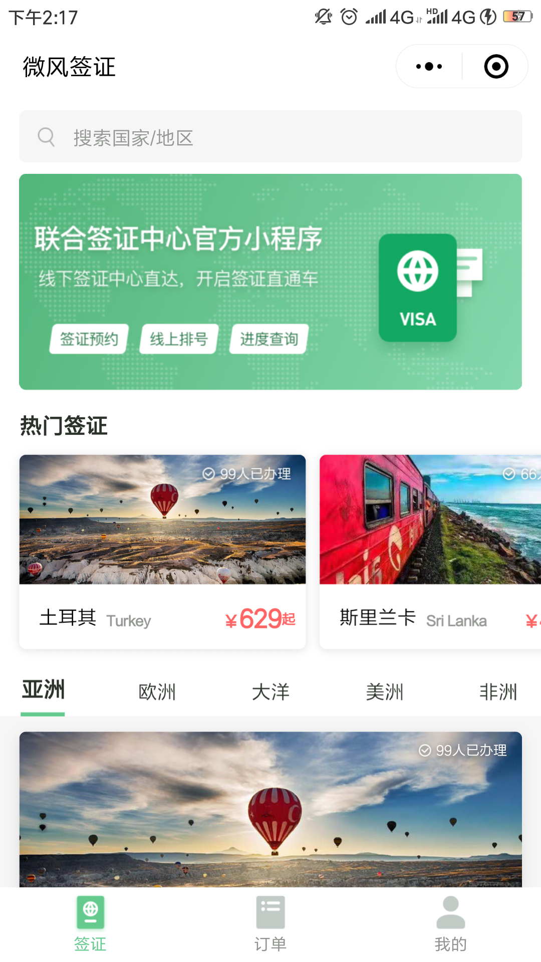 該小程序的首頁,游客既可以查找簽證目的地,又可以在頁面的下方看到商家為簽證所提供的增值服務,同時還有多種簽證類型供你篩選適合自己的,大大滿足了游客的需求的多樣化。