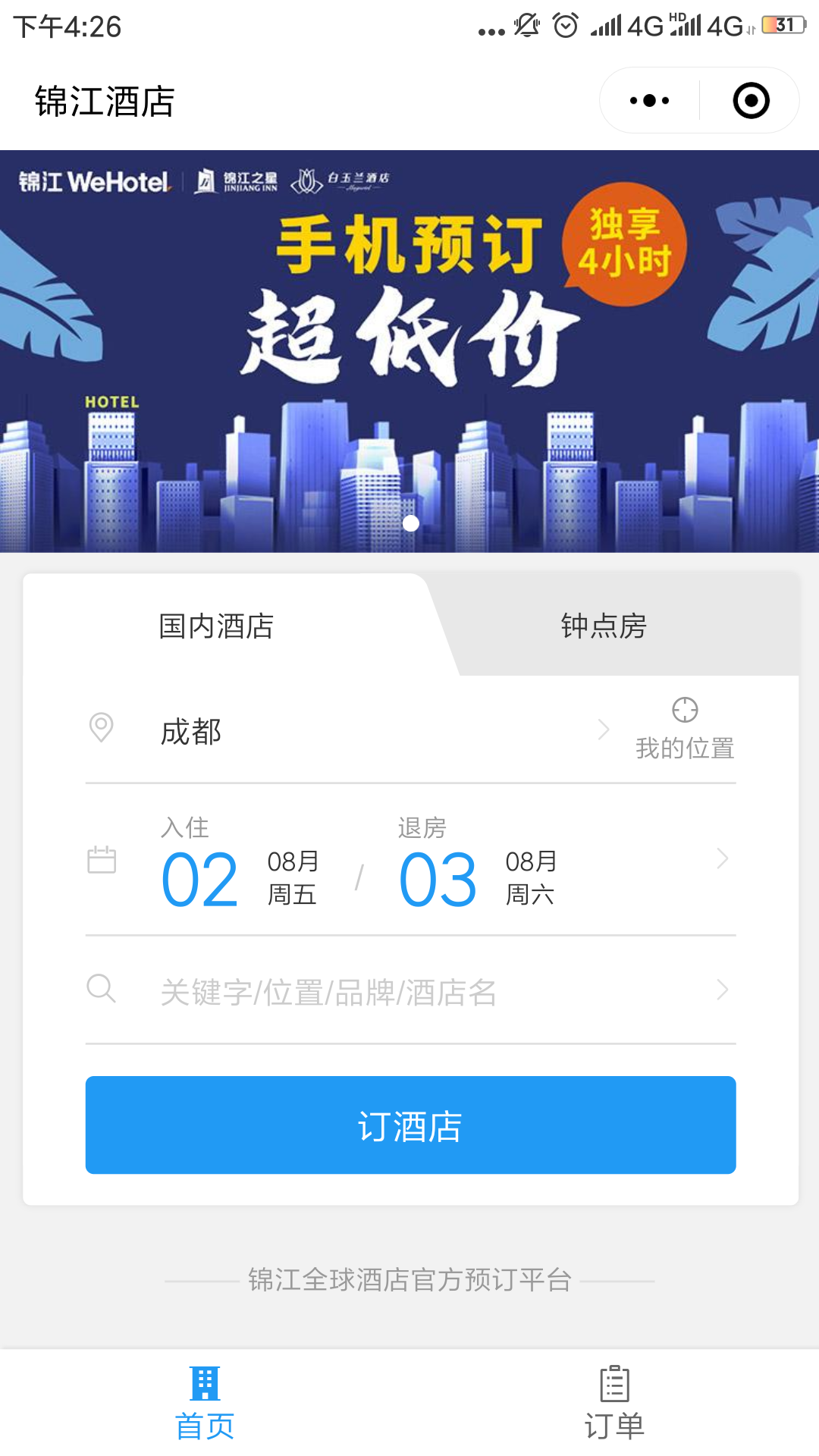 該模板的首頁(yè)分為兩大板塊:一是用banner圖展示出該酒店的優(yōu)惠活動(dòng);二是酒店預(yù)訂功能板塊,游客可通過(guò)選擇國(guó)內(nèi)酒店或者鐘點(diǎn)房,再根據(jù)具體的地理位置,查詢周邊附近的酒店,選擇價(jià)格合適的酒店入住。