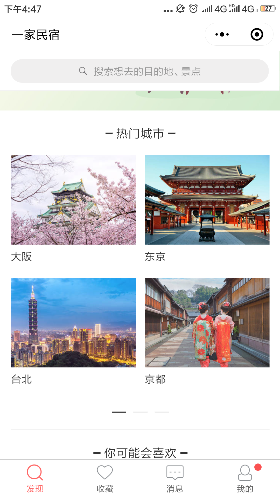 該小程序是全球華人民宿信息平臺(tái),專注于海外。所以該小程序的模板首頁(yè)直接采用城市的圖片進(jìn)行分類(lèi)導(dǎo)航。點(diǎn)進(jìn)某一個(gè)城市,可看到每一家民宿都采用了輪播圖展示住宿的環(huán)境,同時(shí)點(diǎn)擊右上角可進(jìn)行收藏。總的來(lái)說(shuō),該模板的設(shè)計(jì)既貼心,又精美。