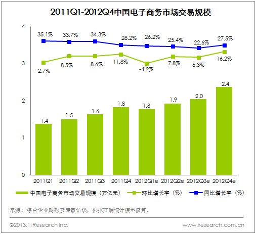 艾瑞咨詢統(tǒng)計(jì)數(shù)據(jù)顯示,2012年中國電子商務(wù)市場整體交易規(guī)模為8.1萬億元,增長27.9%,與2011年32.8%的增速相比,下降了近5個百分點(diǎn);其中2012Q4整體交易規(guī)模為2.4萬億元,環(huán)比增長16.2%,同比增長27.5%。