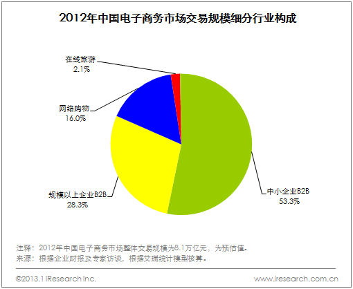 艾瑞咨詢統(tǒng)計(jì)數(shù)據(jù)顯示,2012年電子商務(wù)市場細(xì)分行業(yè)結(jié)構(gòu)中,中小企業(yè)B2B電子商務(wù)占比53.3%,規(guī)模以上B2B占28.3%,企業(yè)間電子商務(wù)合計(jì)占81.6%;網(wǎng)絡(luò)購物交易規(guī)模市場份額達(dá)到16.0%;在線旅游交易規(guī)模占比為2.1%。