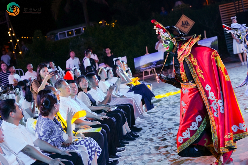 傍晚,絢麗彩霞鋪滿椰風寨沙灘,以四川文旅吉祥物“安逸熊貓”為主視覺元素,搭建起川味濃郁的活動場景。伴隨著高亢、激昂的音樂,神奇的川劇絕活變臉立即點燃現場氛圍,也開啟了當晚的活動。