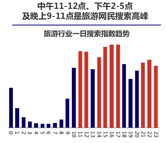 以下是百度營銷中心2013年旅游行業對于搜索人群的具體時間的分布研究報告,以下是具體的統計圖供大家形象的參考: