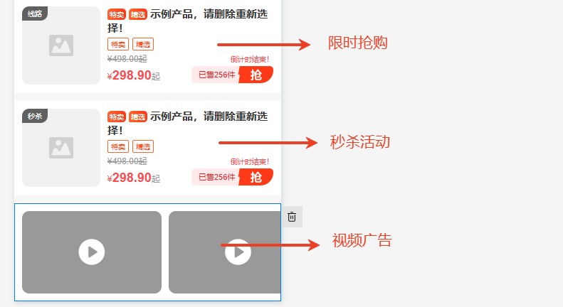 視頻廣告:最多支持添加3個不大于10M的視頻,可設置布局方式。