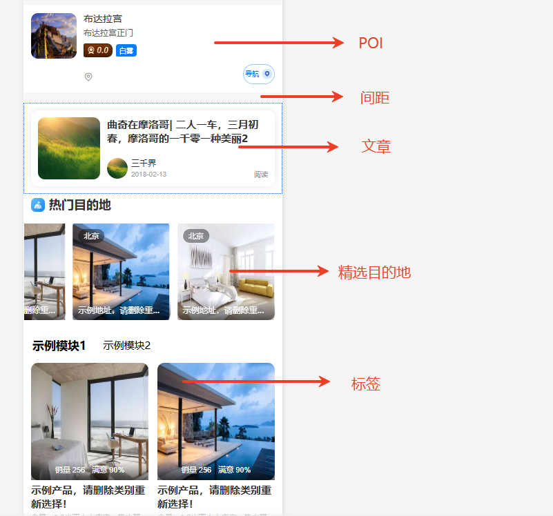 POI地址:用于選擇帶有地址的商品(景點、酒店、露營、美食),一個組件僅支持一個商品,支持設置布局樣式。