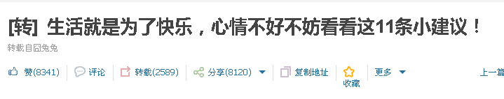 首先,每當(dāng)我們發(fā)表一篇文章,一定要分享到空間再轉(zhuǎn)載到微博,因?yàn)槲覀凕c(diǎn)擊進(jìn)入一篇文章,標(biāo)題下方有贊、評(píng)論、轉(zhuǎn)載等一系列標(biāo)簽。這些評(píng)論和轉(zhuǎn)載的次數(shù)就是對(duì)一篇文章最直接最可觀的評(píng)價(jià)。如果數(shù)量不錯(cuò),網(wǎng)友會(huì)更愿意看下去。這樣的話才讓多個(gè)地方都能帶來流量。