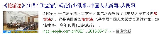 我們在百度搜索框中輸入“旅游法”彈出的的網(wǎng)頁中會出現(xiàn)這樣圖文并茂的網(wǎng)頁條。如下圖所示:
