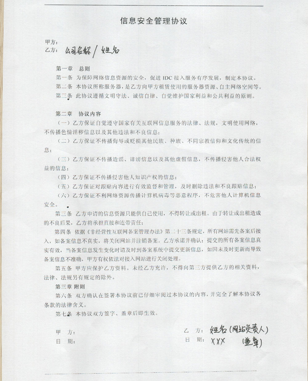 2、 網站信息安全管理協議書1份 (蓋公章)