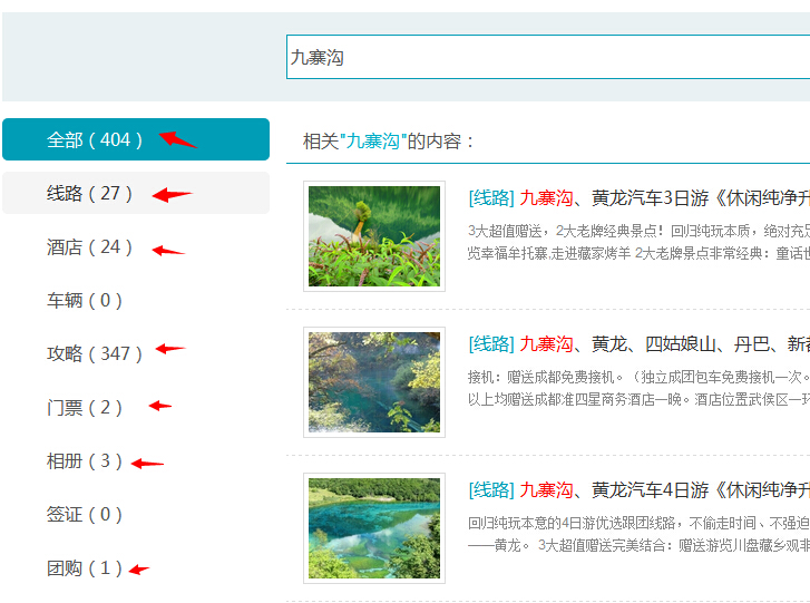 如圖所示,搜索”九寨溝“可以快速的將整站的線路、酒店、攻略中含有九寨溝的信息查詢出來。