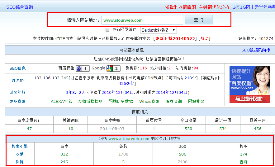 方法二、使用站長工具網站查詢 以站長之家的站長工具為例。打開站長工具網站,在網址框輸入要查詢收錄數的網址,這里以www.sdwrbc.com.cn為例即可查詢: