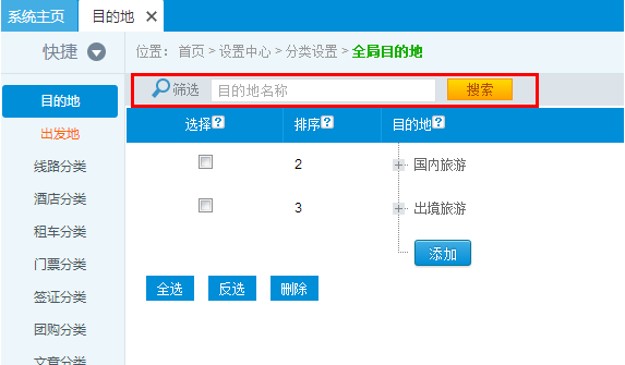 登陸后臺,點擊分類設置,在展開菜單中選擇目的地,