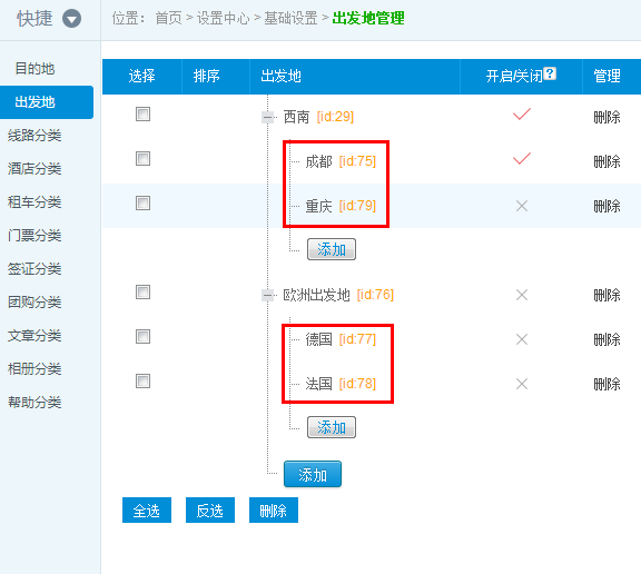 我們在添加內容的時候,需要選擇出發地,這里的第一級菜單(西南,歐洲出發地)并不會出現在出發地的選項中,因為他是分類名稱。而第二級菜單(成都,重慶,德國,法國)才是我們設置的出發地。