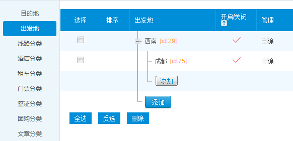 第一級并不是出發地,而是分類作用,考慮到當出發地很多的時候,就需要進行區分,這樣才能快速的進行查找和修改,所以這里做了分類處理。