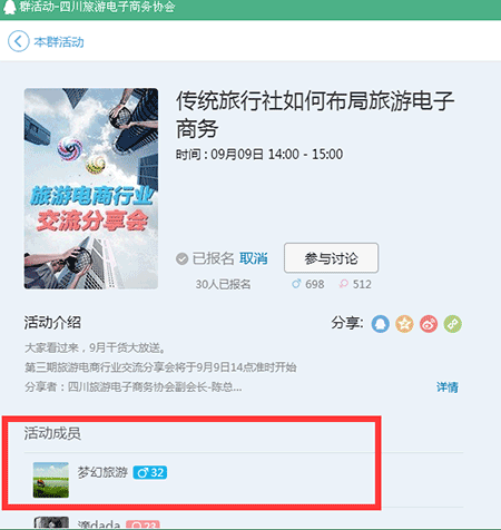 一般QQ群里面有一個叫QQ群活動的應用,當群主創建活動后,很多有意向的人會報名參加活動,比如是一個旅行社的群,里面有很多游客,當大家看到創建的活動后,點擊報名,點擊報名后,所以這部分人是有意向的,在活動結束之前,你可以采用技術的方式,將這部分人的QQ號碼獲取下來,然后針對性的去銷售,相信是有一定作用的!