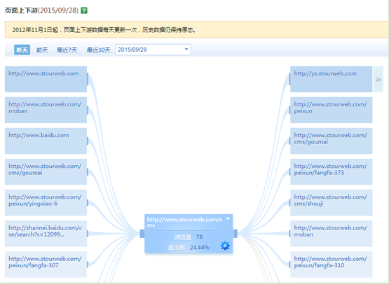 通過頁面上下游,我們可以設(shè)置需要分析的頁面,獲知他們的來路以及流量從這個頁面分發(fā)后又進(jìn)入了哪些頁面。