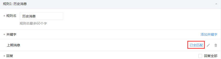 比如我們添加一個(gè)規(guī)則名為:歷史消息。添加關(guān)鍵字為:上期消息。回復(fù)內(nèi)容為兩張圖片,選擇“已完全匹配”,并且位勾選“回復(fù)全部”。