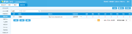 在思途CMS系統(tǒng)后臺(tái)“優(yōu)化應(yīng)用”板塊里面有“智能內(nèi)鏈”選項(xiàng)!如下圖: