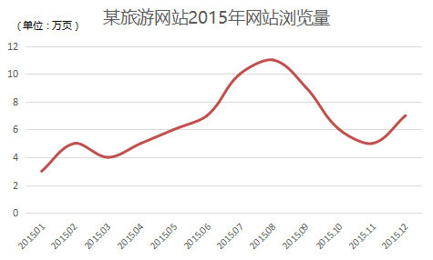 網站瀏覽量可以反應游客訪問網站的流量變化趨勢。下圖顯示了某旅游網站從2015年1月至12月的網站瀏覽量情況,通過分析數據可以看出,網站流量在7月出現明顯上升的現象,9月之后緩慢下降。結合網站實際運營情況,網站瀏覽量的變化可能和旅游進入旺季和網站的營銷推廣有關。另外,網站瀏覽量也能反應出旅游網站針對搜索引擎優化的程序和效果。