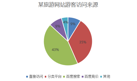 分析游客訪問來源,了解游客是通過何種方式進入網站,有助于幫助站長明確推廣方式。下圖顯示某旅游網站游客主要通過百度搜索和分類信息平臺進入網站,那么站長就應該重點針對網站做好SEO優化,并且同時加強分類信息平臺推廣工作。
