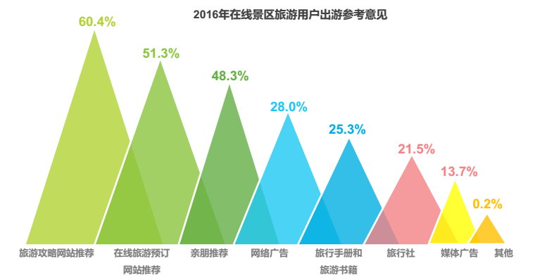 超過一半的在線景區(qū)旅游用戶在出游時(shí)會(huì)參考旅游攻略網(wǎng)站(60.4%)和在線旅游預(yù)訂網(wǎng)站(51.3%)的推薦。艾瑞分析認(rèn)為,在線用戶出游參考意見更加專業(yè)化,通過旅游達(dá)人真實(shí)口碑和專業(yè)旅游網(wǎng)站的建議,能夠更有針對性的選擇目的地。