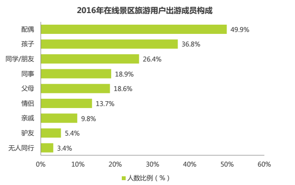49.9%的在線景區(qū)旅游用戶選擇和配偶結(jié)伴出行,其次36.8%的在線用戶選擇和孩子一起親子游,由此可見用戶更傾向于家庭結(jié)伴出游。