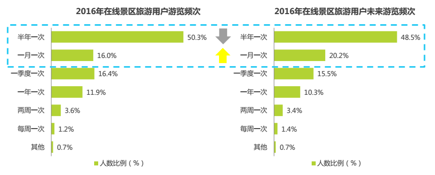50.3%在線景區(qū)旅游用戶選擇半年出游一次,頻次愈加頻繁