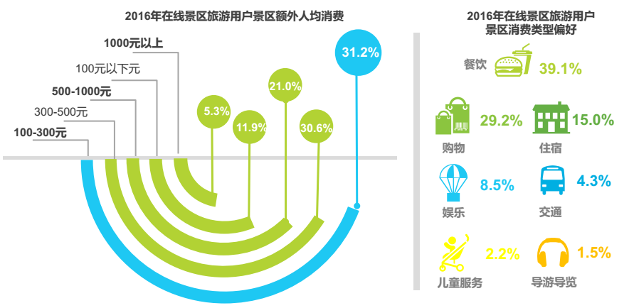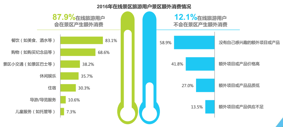 87.9%在線景區(qū)旅游用戶會(huì)額外消費(fèi),餐飲消費(fèi)居首位